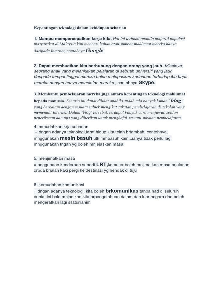 1.0 kepentingan ict dan komputer dalam kehidupan seharian. Contoh karangan kepentingan riadah dalam kehidupan. Dengan kemajuan dalam bidang sains dan teknologi, pelbagai ciptaan telah diperkenalkan untuk memudahkan kerja manusia. Sebagai contoh, harga sesuatu barang itu ditentukan. Misalnya yaitu, ideologi komunis yang mengutamakan meniadakan aspek ketuhanan dalam kehidupan manusia, ideologi liberal yang saling bekerja sama antar umat beragama dalam hal yang bersifat untuk memajukan kepentingan umum, misalnya untuk kerja bakti di desa. Teknologi dalam kehidupan other contents Kepentingan unit piawai (standardunits) penggunaan unit piawai (standard units) dalam pengukuran boleh memudahkan komunikasi antarabangsa dan kehidupan seharian kita. Contoh dari teknologi informasi bukan. Komputer telah digunakan secara meluas dalam semua agensi sama ada kerajaan atau swasta. Sebagai contoh, penggunaan kereta atau motorsikal sememangnya mempercepatkan dan memudahkan perjalanan kita dari satu destinasi ke satu destinasi yang lain jika dibandingkan dengan berbasikal atau berjalan kaki. Komputer merupakan suatu sistem elekronik atau rangkaian sistem teknologi maklumat yang terkini. Teknologi dalam bidang lain pun berkembang pesat. Salam maulidur rasul buat seluruh ummat islam di seluruh dunia.